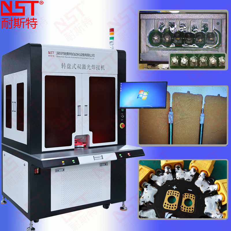 轉(zhuǎn)盤式雙激光雙工位焊錫機(jī):焊接工位1和焊接工位2 可將產(chǎn)品一分為二進(jìn)行焊接,相對單工位焊接設(shè)備可縮短模組交替等待的時間,提高焊接效率。