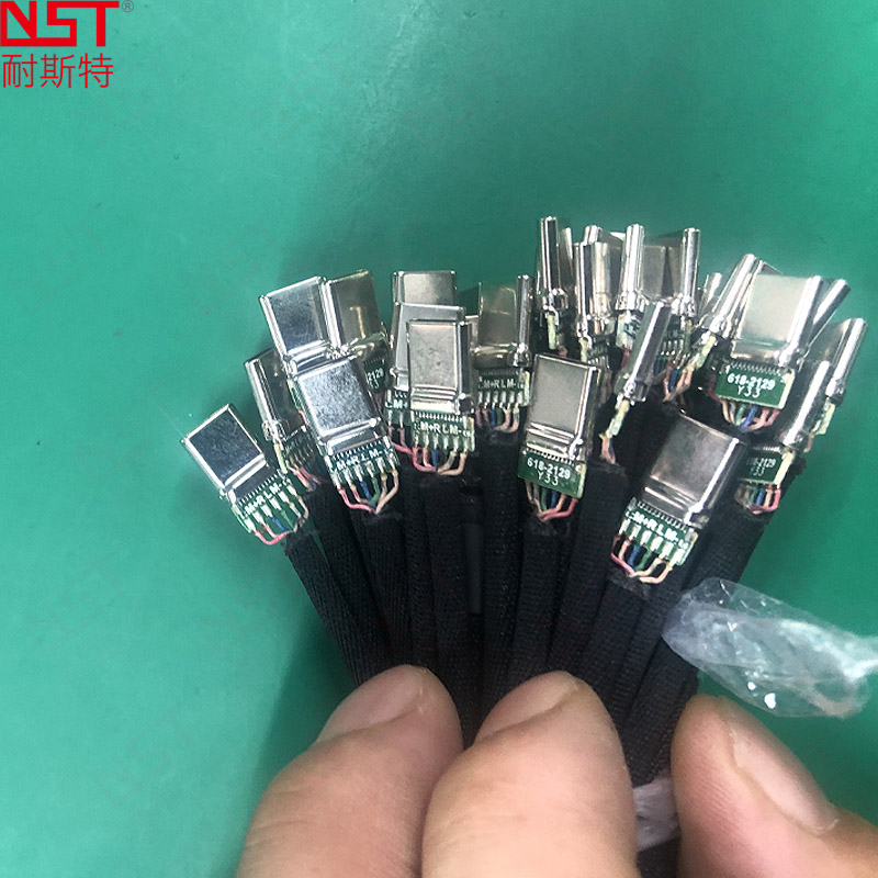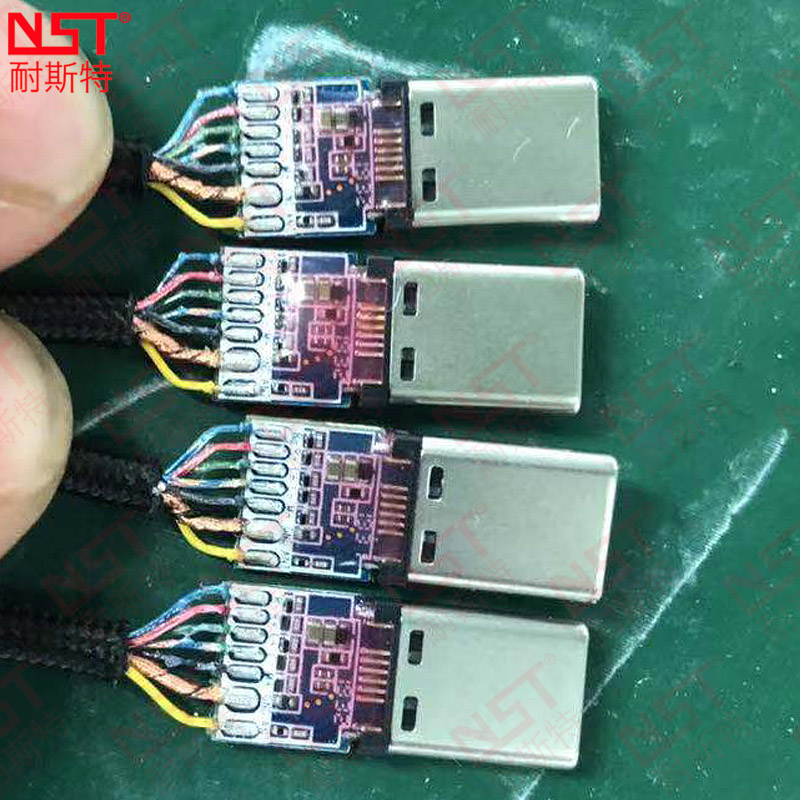 人工擺線→AOI視覺識別→線材整形→線材預切→激光去漆(線材開口)→激光預切→半剝剝線→沾助焊劑→沾錫→激光精剪→A公端子自動上料→Type-C端子自動上料→人工對位→焊接A端→焊接C端→人工焊點檢測→正面UV噴膠固化→翻轉治具→反面UV噴膠固化→人工取線→治具回流→循環(huán)
